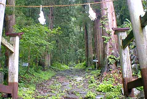 1300年前の昔、小菅神社は修験道の行者によって建立されたと言われている、国の重要文化財、小菅神社が山の中腹にあり、かつては、戸隠、飯綱と並んで北信濃三大修験の里のひとつに数えられていた。この修験道には、樹齢200年から300年という古木の杉並木が約800mにわたり続き、荘厳な雰囲気を漂わせていることから神の森と呼ばれている。 |
