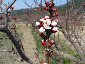 このところの暖かさにつられ、あんずの里のあんずが一部開き始めました。