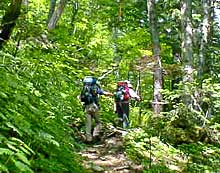 ブナや唐松の登山道を行く |