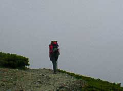 2日目は6時出発で常念に向かいました。この日もあいにくガスに巻かれ穂高連峰や槍ヶ岳の姿を見る事は出来ませんでした。ガスの中蝶槍をめざして進みました。