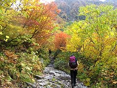横尾より1時間位のところに位置する本谷橋は冷たい清流があり、休憩にはぴったりのところです。また周囲の紅葉風景もまた素晴らしいです。
