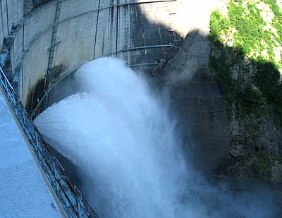 7年の歳月をかけ昭和38年に完成、高さ186m、堤長492m、貯水量約2億tという日本最大のアーチ式ダムです、6月26日から10月15日の間は毎秒10数tもの観光用放水が行われその放流音は豪快です。