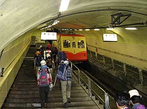 黒部湖駅(標高1455m)から黒部ケーブルカーで5分、片道料金840円。最大傾斜31度、全長0.8k、標高差360mの日本では唯一の全線地下式ケーブルカーで、前か後の窓側で坂を登っていく様子を眺めると楽しめます。 |