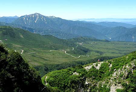 登りの途中薬師岳と富山側の美女平よりつづくバス道を撮る |