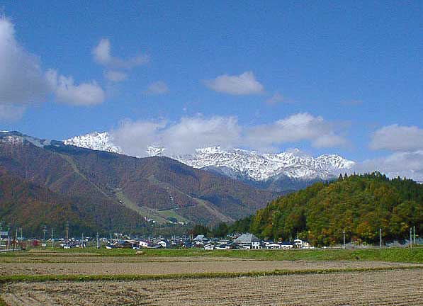 白馬村神城方面より初冠雪の北アルプスを望む 【秋・紅葉の白馬村 025-9】