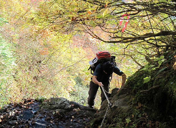 輝く紅葉をバックにクサリ場をのぼる登山者 [秋 紅葉の戸隠牧場と高妻山031-9]