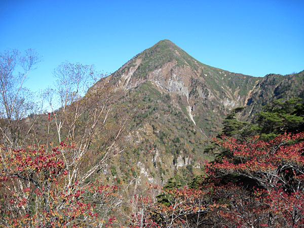 途中よりピラミダルな高妻山を望む [秋 紅葉の戸隠牧場と高妻山031-11]