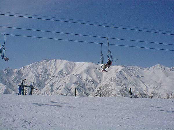 快晴の北アルプスをバックにゆったりリフトで冬山の風景を楽しむ [冬 白馬五竜スキー場 021-1] |