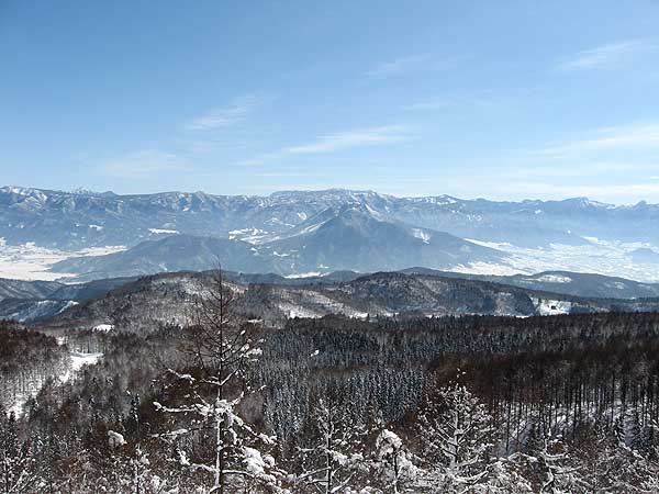 途中の景色より、遠くに志賀の山並が望め、手前には木島平の高社山から善光寺平が望める。 |