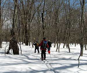 日差しが明るくなって来た森をのんびりとまわりの風景や鳥の声、戸隠連峰を眺めながら、早春のスノーウォーキングを楽しむ。