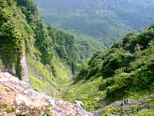 ここから一不動まで縦走。途中きびしいアップダウンと垂直にそそり立つ岩壁のふちをタイタニックの船首の上に立っている気分で歩く。 |