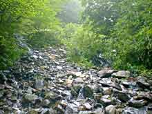 一不動から戸隠牧場までの下山の登山道は沢沿いに行きますので沢水も流れており、沢の中を歩く部分も多々あります。またクサリ場も数カ所あり、斜面状になっていますので濡れて滑りやすく、慎重な対応が必要となります。 |