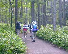 | 涸沢や穂高、槍ヶ岳に向かう登山者の上高地バスターミナル休憩所の朝の出発前の風景。登山者カードの提出、朝食、最後の荷造りなどあわただしい出発前。 |