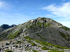 大喰岳(3101m)から中岳(3084m)へ、3000mからの豪快な景色を楽しみながら、好天に恵まれた尾根を行く。 |