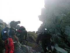 最初から鋭い落ち込みで、足場を一歩一歩確保しながら慎重に進む。先には鋭い岩場の尾根が望め気が引き締まる。垂直の長い鉄ハシゴ、急峻な岩場をクリアしながら慎重に進む。他のパーティーの人達も慎重にまた確実に岩場をクリアして行く。30分ほどの下りで最初の難関の下りをクリアする。